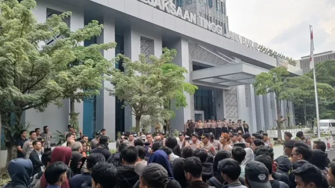 Mereka menggelar aksi unjuk rasa di Kantor Kejaksaan Tinggi (Kejati) Jawa Barat, Jl. L. L. R.E. Martadinata No.54, Citarum, Kota Bandung, Selasa (11/2/2025).