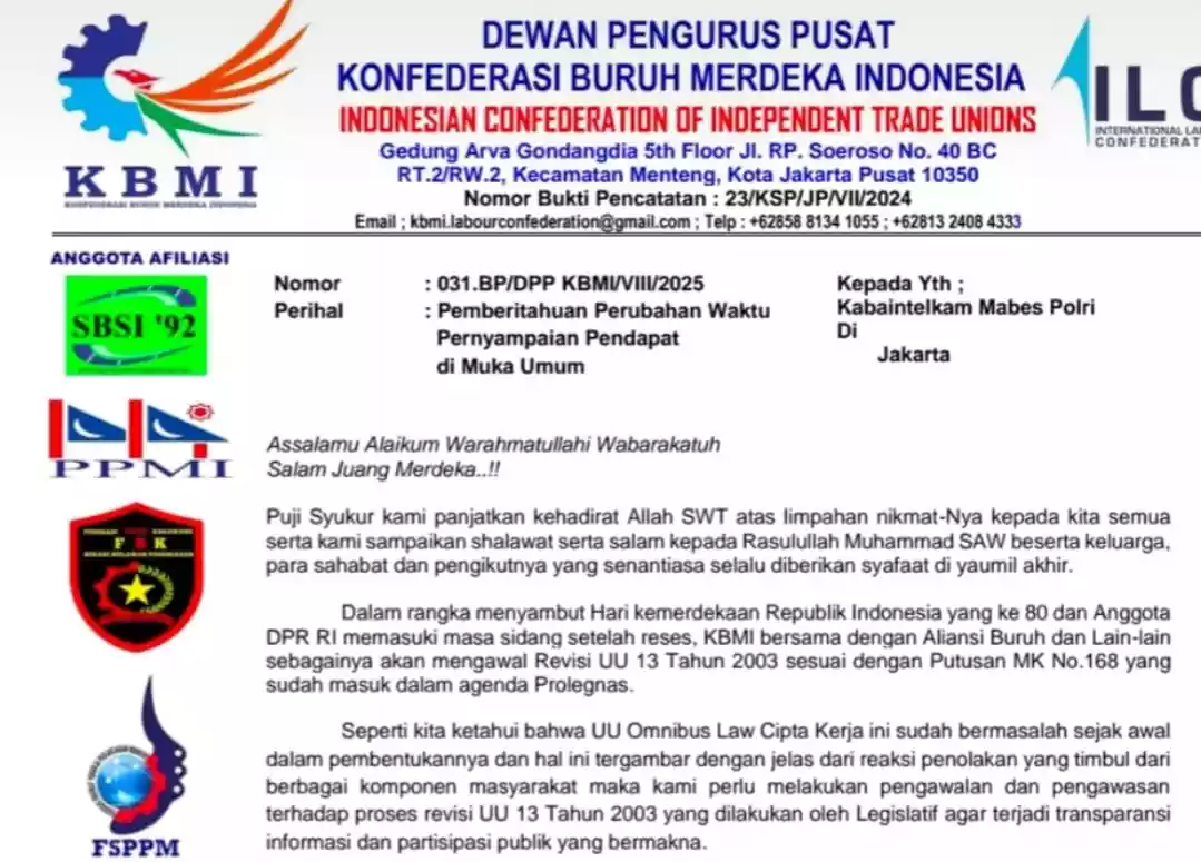 Surat resmi KBMI bernomor 031.BP/DPP KBMI/VIII/2025 menyebutkan, aksi ini akan diikuti sekitar 500 buruh dari berbagai daerah, dengan titik kumpul di Fly Over Senayan dan berakhir di Gedung MPR/DPR RI serta Patung Kuda, Jakarta Pusat.