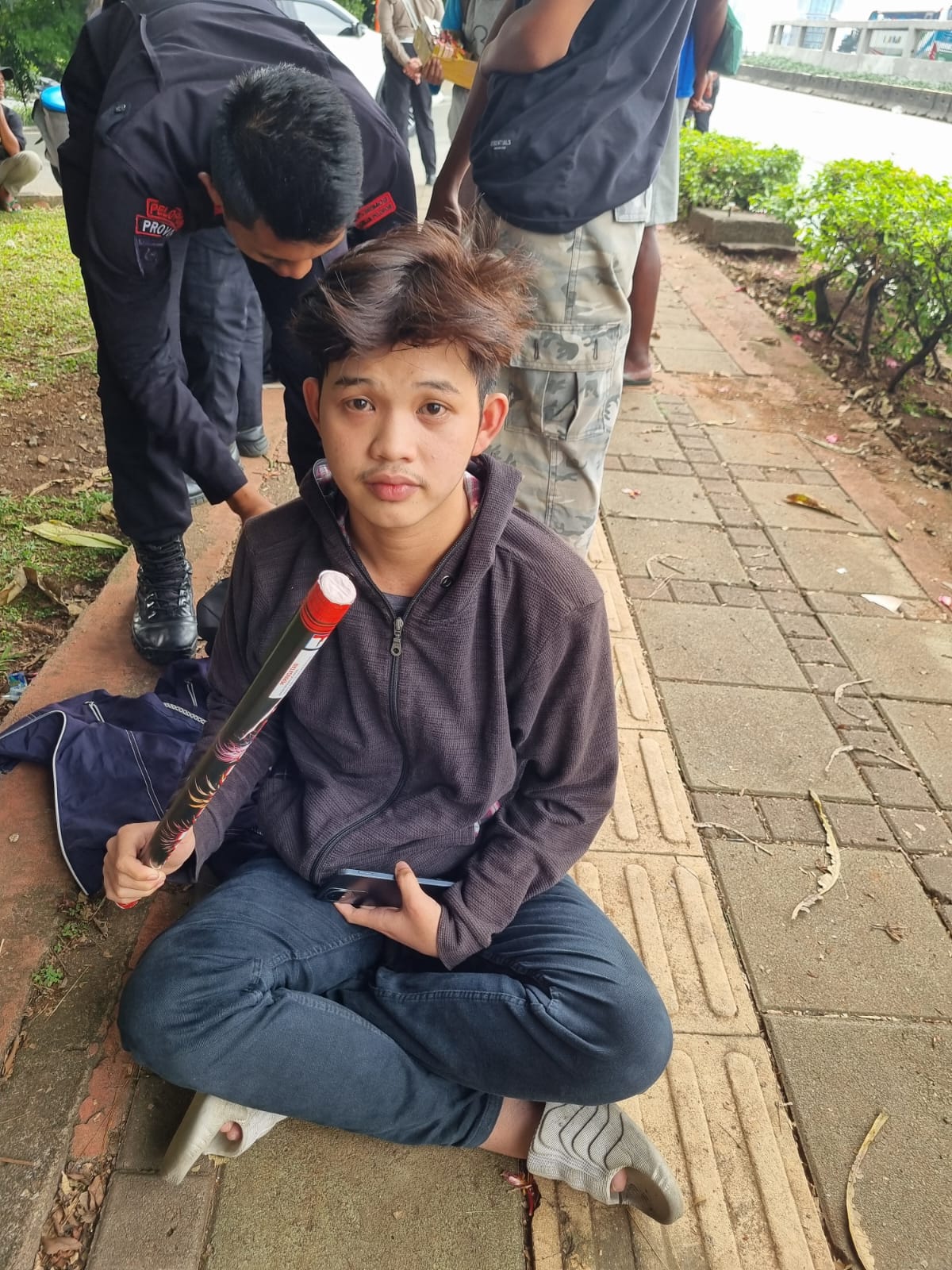 Sekitar pukul 13.53 WIB, aparat mengamankan dua pelajar di kawasan Simpang Kementerian Kehutanan. Identitas keduanya yakni IR, pelajar kelas 2 SMA YPIP Petojo, Jakarta Barat. Dari tangannya ditemukan petasan yang siap diledakkan.